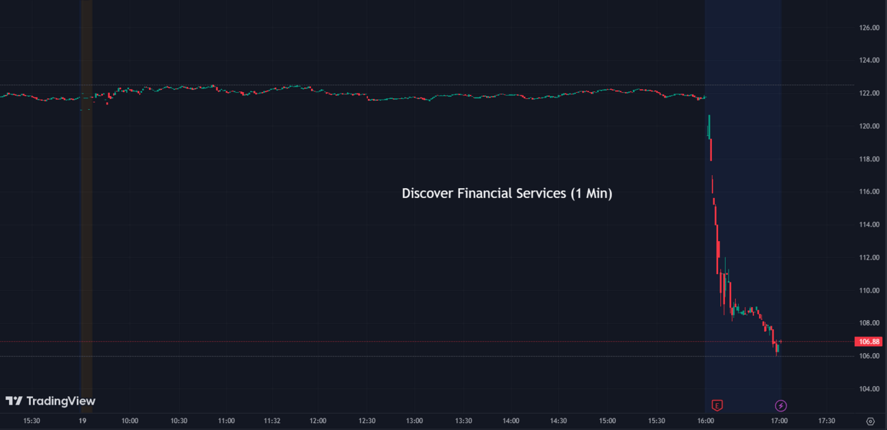 Discover Financial (DFS), a digital banking company, saw a sharp 13% decline in its shares following its second-quarter results, which fell short of analysts' expectations. The company reported earnings per share of $3.54 on revenue of $3.88 billion for the quarter. Analysts had projected earnings per share of $3.67 and revenue of $3.88 billion, according to FactSet. Discover also revealed that it is engaged in discussions with regulators regarding a "card product misclassification" matter and has temporarily halted share buybacks.