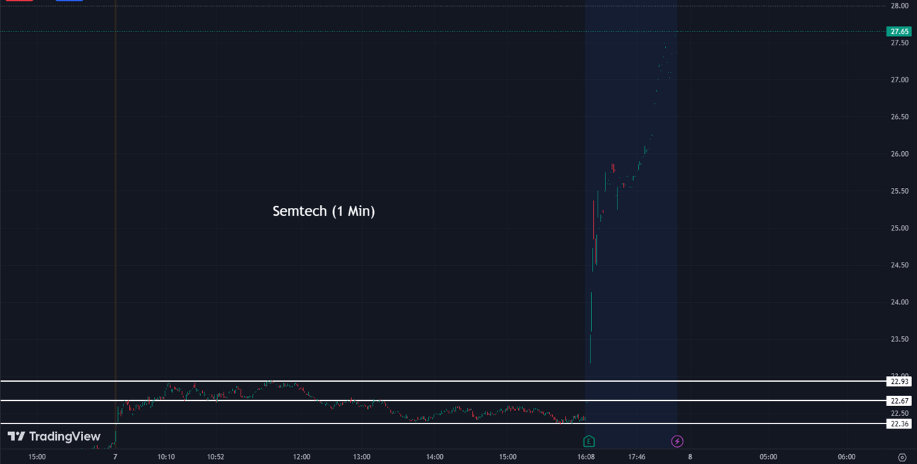 Semtech (SMTC) reported better-than-expected first-quarter earnings and revenue. The company's stock rose 21% in after-hours trading. Despite a net loss of $29.4 million, or $0.46 per share, Semtech exceeded analysts' estimates. Adjusted income was $1.5 million, or $0.02 per share. Revenue for the quarter reached $236.5 million, beating expectations. For the second quarter, Semtech expects earnings between a loss of $0.02 and $0.06 per share, with net sales projected to be between $233.0 million and $243.0 million.