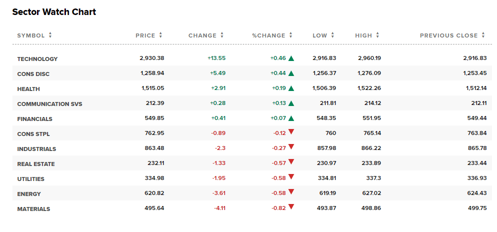 5 out of the 11 sectors closed in the green today, with Technology leading the way up by +0.46% and Materials falling back by -0.82%.