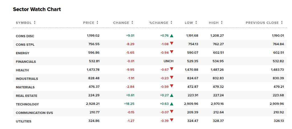 Out of the 11 sectors, 3 closed in the green today. The Consumer Discretionary sector led the way, gaining 0.76%, while the Consumer Staples sector lagged behind, declining by 1.08%.