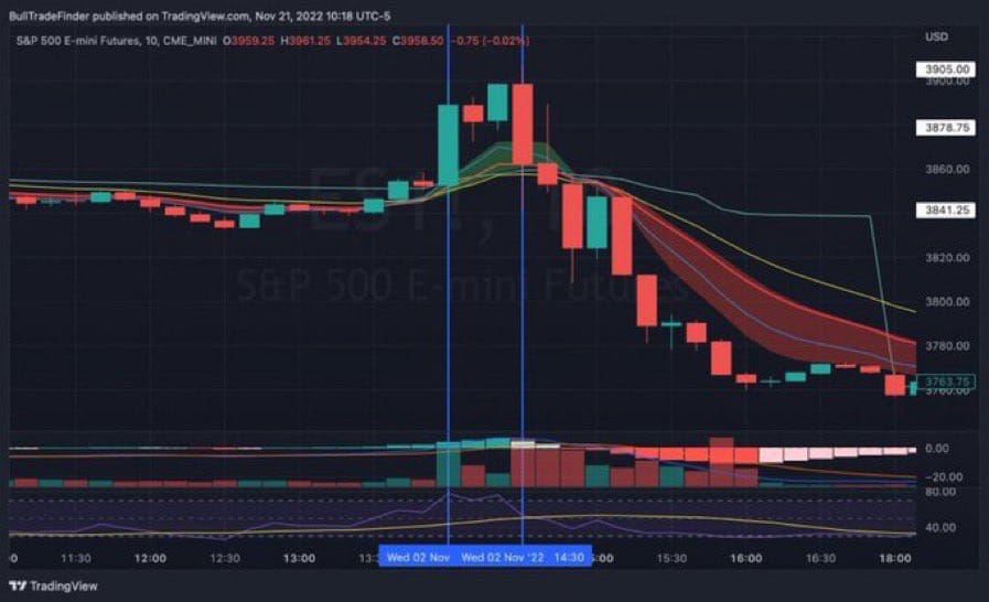 Nov 2 #FOMC Initial Reaction on $SPY $SPX to upside at 2PM, big green candle, opposite move as usual at 2:30 leading a $140 POINT SELL IN UNDER 2 hours for the E-Mini